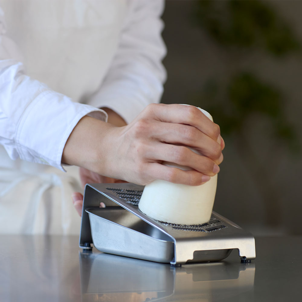 大根おろし本来の美味しさを追求し、職人が研究を重ねてたどり着いた17°の傾斜。刃と刃の間に隙間を作ることで、おろした素材が詰まりにくく、スムーズにおろすことができます。食材の繊維を潰さず、水分を多く含んだふわふわなおろしが作れます。